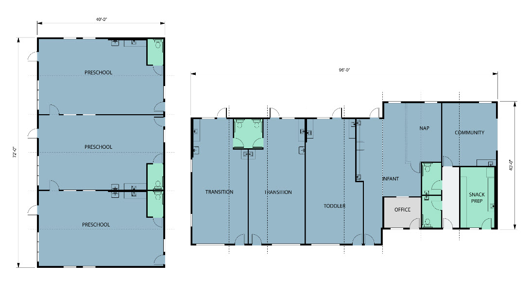 A 96′ x 40′ main wing and a 72′ x 40′ preschool wing