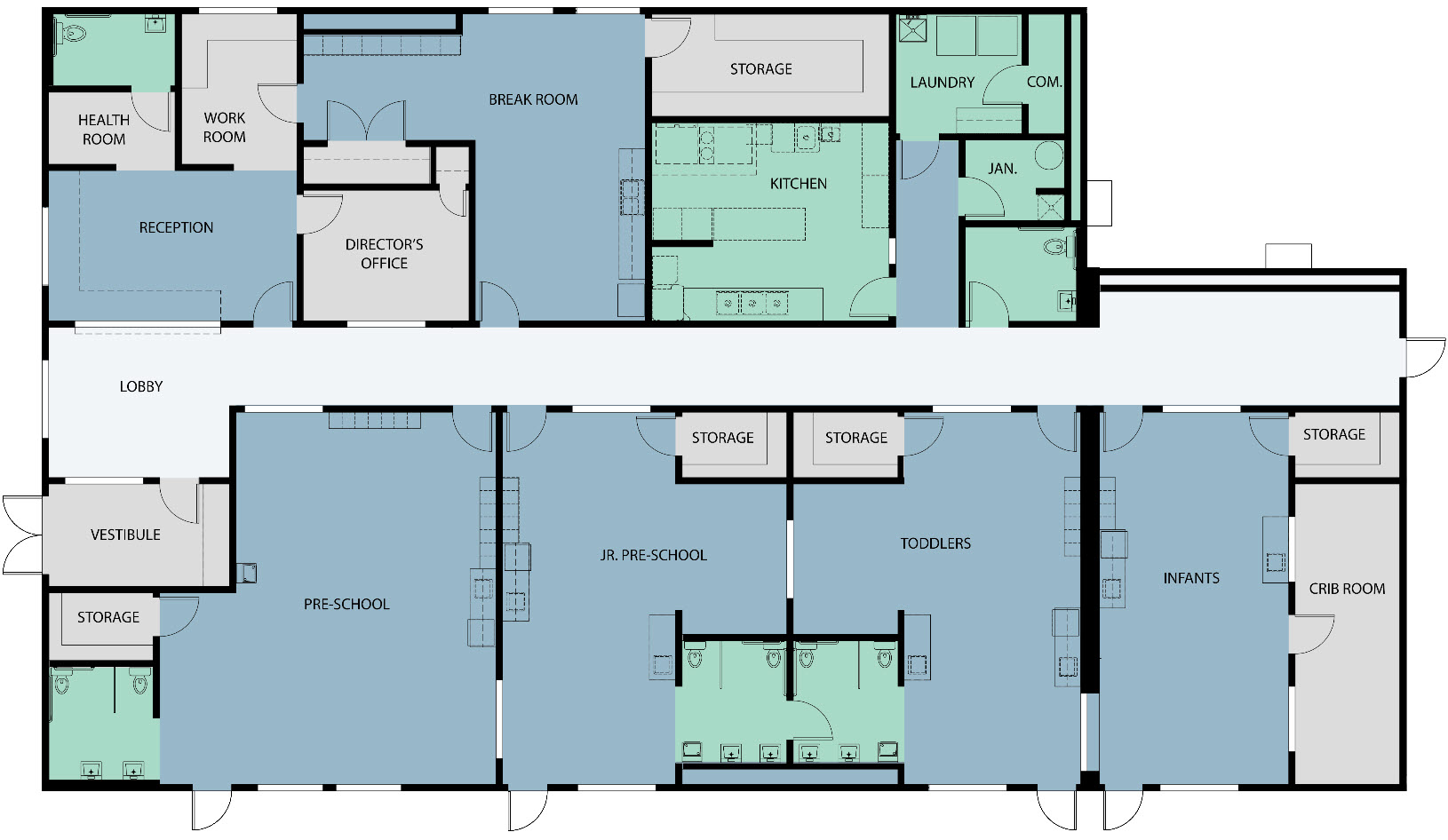 The Child Development Center also features operable tubular skylights for natural lighting, a bright and welcoming reception area with custom casework, ADA restroom facilities with low-flow plumbing fixtures and a fully equipped kitchen with a stainless steel commercial vent hood and appliances.