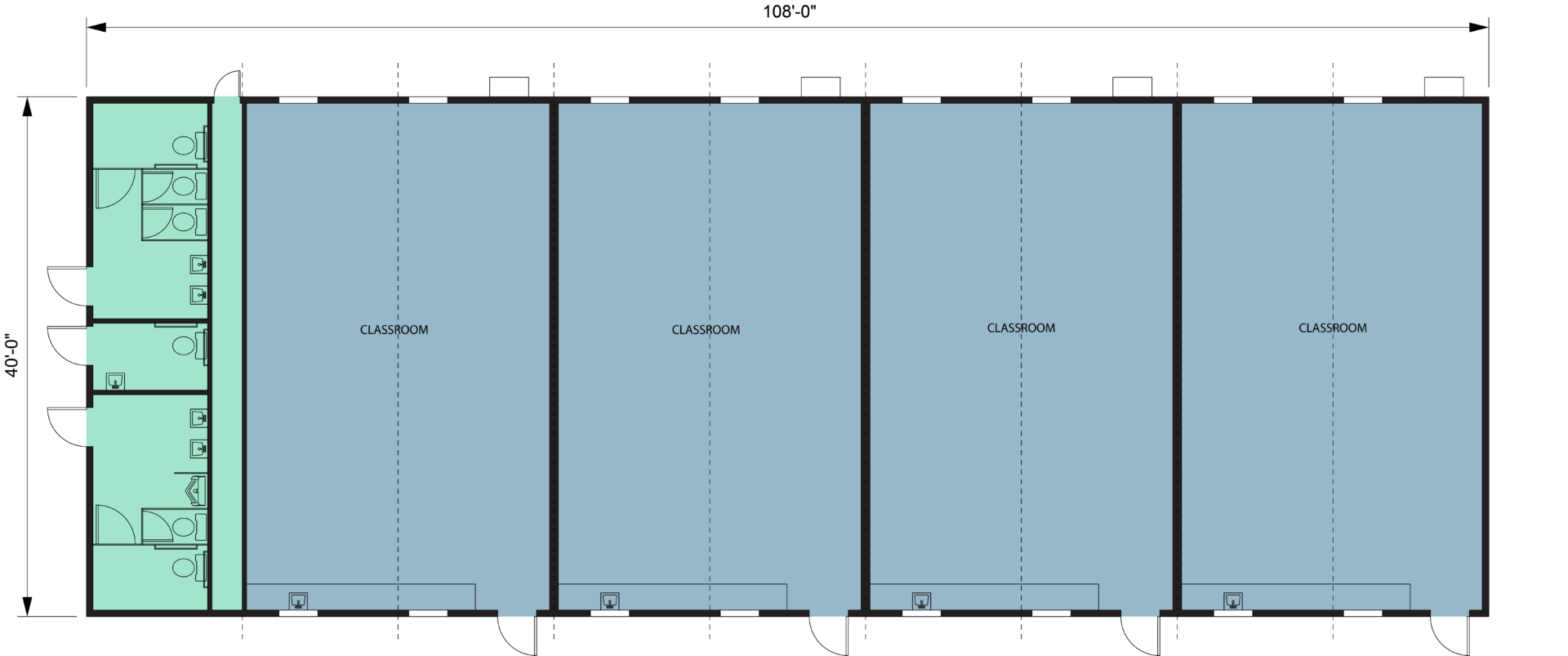 Included was a new Enviroplex 108′ x 40′ classroom building with integral restrooms.The building, as design by LBDG, incorporated low VOC products and sustainable materials. The Enviroplex pitched roof design incorporates a Title 24-certified Cool Roof, including six Solotube skylights per classroom and a high reflectivity/low emissivity standing seam roof covering.