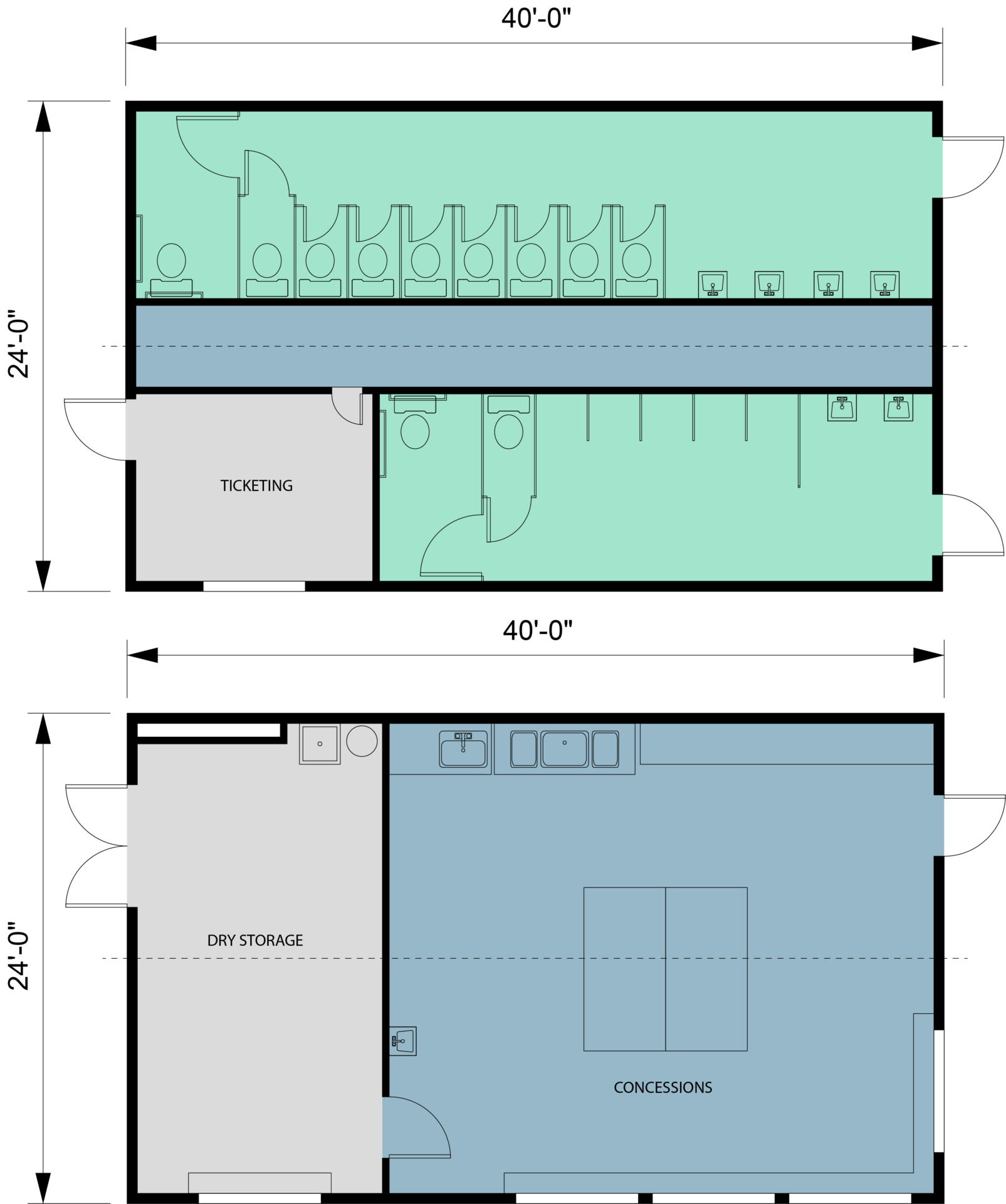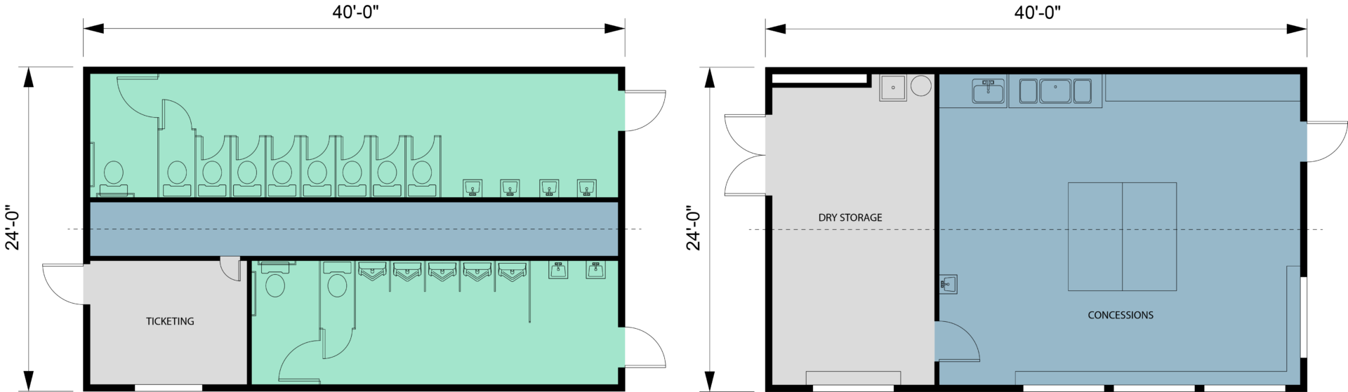 The multi-fixture men’s and women’s restroom building also includes a 13×10 ticket booth located on the north corner and welcomes visitors before entering the stadium. The restrooms are accessed from the playing field side of the grand entry. The finished exterior is also three-coat stucco, harmonizing the new facilities.