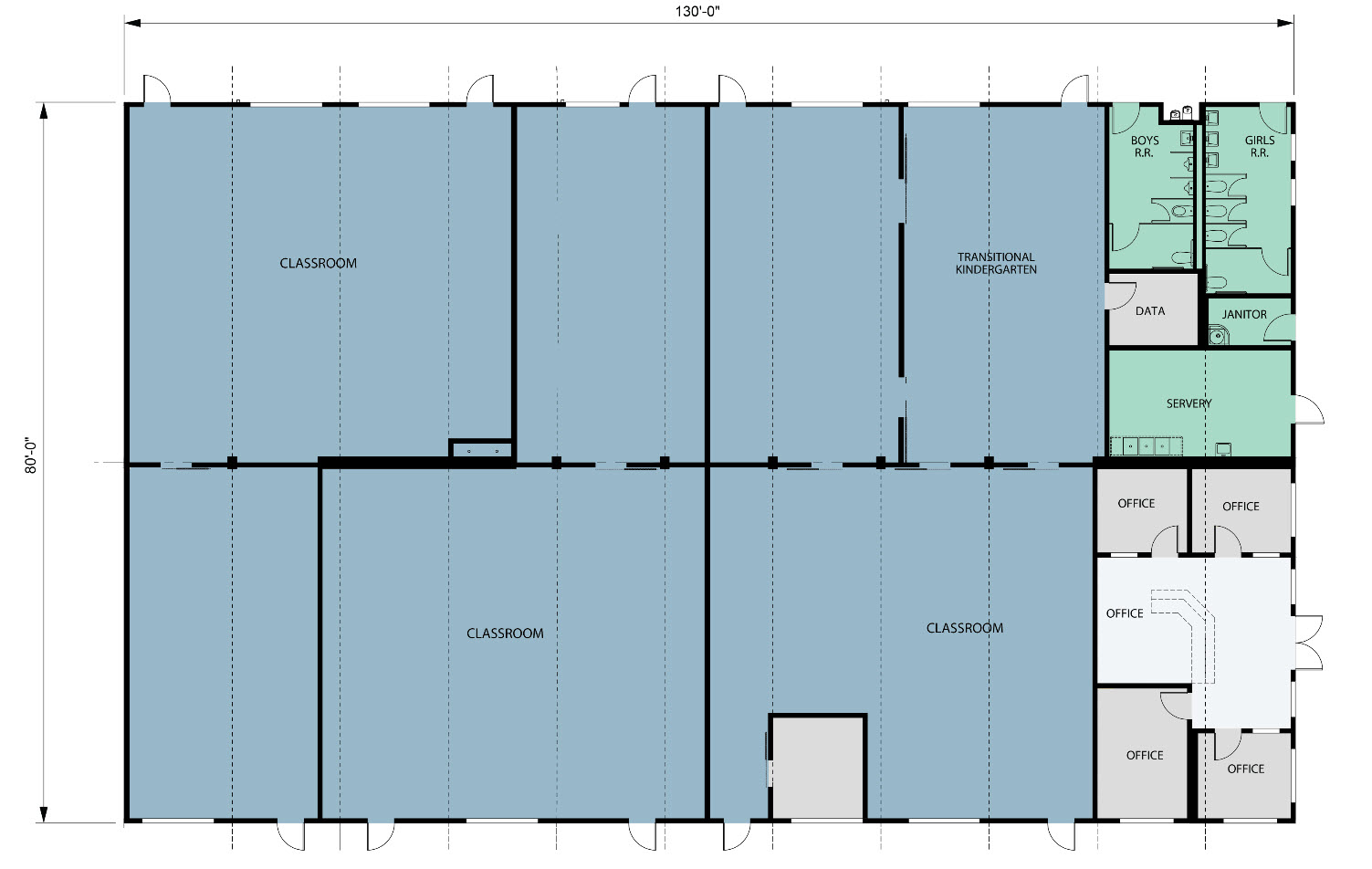 The two story building is a 130×80 back-to-back design with a three sided wraparound exterior corridor. The interior spaces are comprised of administration and dedicated staff offices, classrooms for traditional curriculum, boy’s and girl’s and staff multi-fixture restrooms, custodial room, and IDF data space.